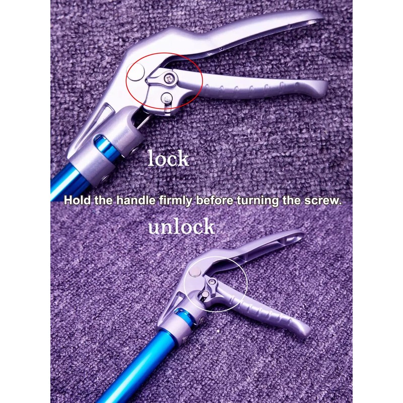 - Unlock Instruction: Hold the handle firmly before turning the lock buckle. Just hold the handle firmly and turn the lock buckle, and it unlocks.The handle lock makes the snake tongs easy to store.