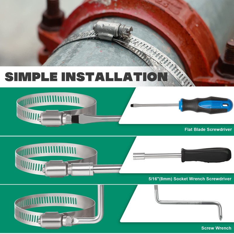 - 【Powerful Tightening Capability】To eliminate concerns about break out and strip out,our stainless hose clamps is designed with a reinforced and widened steel band,featuring through-hole manufacturing craftsmanship,precise polished surface without burrs,a large torque that tightly locks and fixes hoses to effectively prevent pipeline leakage issues,and the hose will not incur any damage