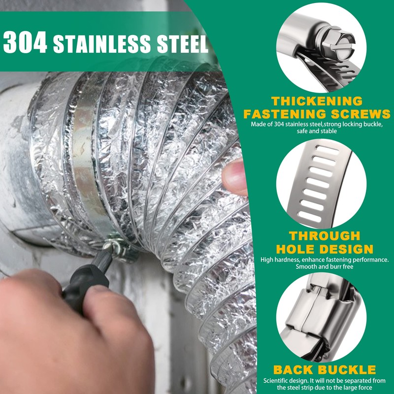 - 【304 Stainless Steel Hose Clamps】The large duct clamps are all made of heavy-duty 304 stainless steel(includes steel strips,housing and screws),which is a strong and durable material.Even in harsh environmental conditions,still provides excellent corrosion and rust resistance,ensure long-lasting use
