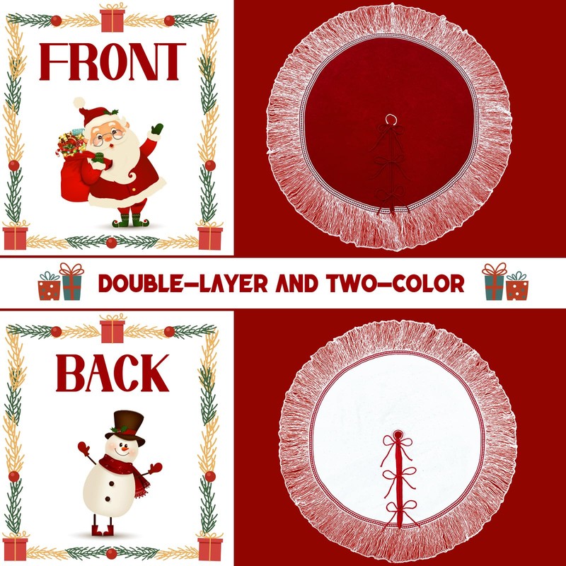 - WINE RED WHITE TASSEL STYLE: This 48 inch Christmas tree skirt features wine red as the main color tone, paired with exquisite white tassel decoration. This design makes it particularly luxurious and unique at Christmas parties. The popular red is full of festive design, which fits perfectly with the Christmas theme color.