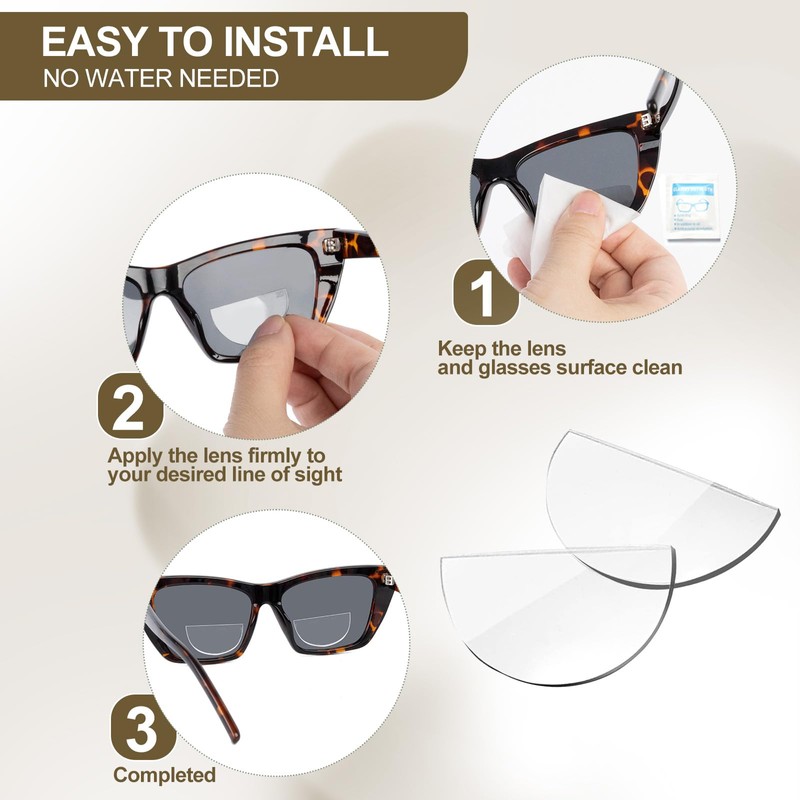 - 【Maximum Adhesion 】The bifocal lenses are engineered for maximum adhesion without requiring any adhesive or water. They can be conveniently detached and reused as many times as necessary.