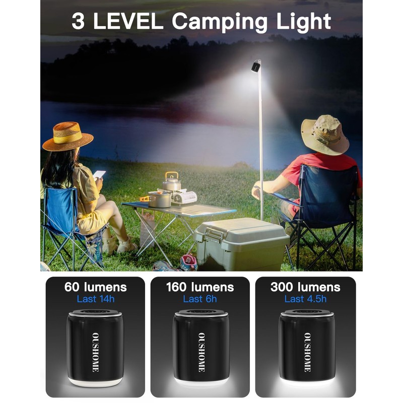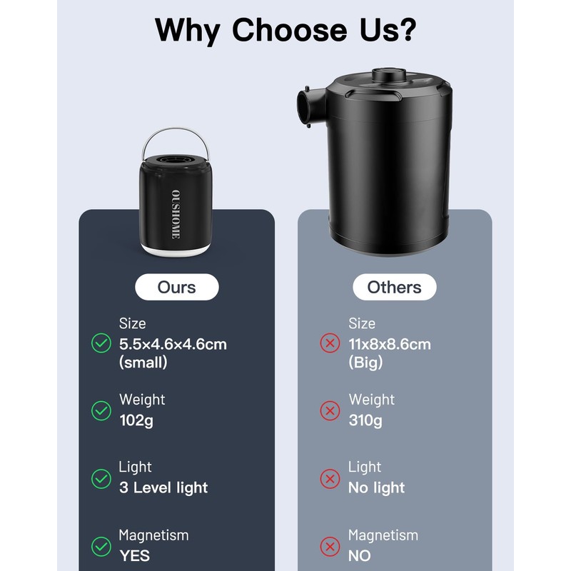 - Magnetic Design and Camping Light: Oushome air pump for pool floats is equipped with a magnetic ring that allows it to easily adhere to any magnetic surface, such as tent poles, bodywork and other metal surfaces. This air mattress pump also features a 3-level lighting function with a brightness range of 60-300 lumens, which can be used either as a camping light to hang inside the tent or as a flashlight