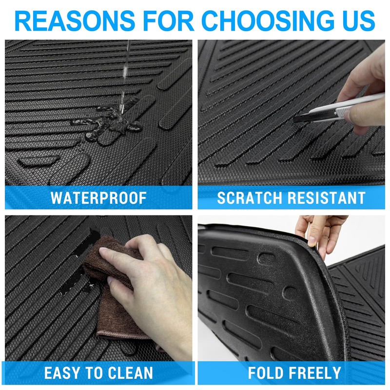 - 【Odorless & Durable TPE Material - Built to Last】No more stinky rubber smells! Made from flexible TPE that stays tough through winters and summers, unlike rigid rubber mats that crack over time. Our trunk mat will bounces back after loading. Good for road trips, heavy camping gear or fragile groceries without worrying about tears.