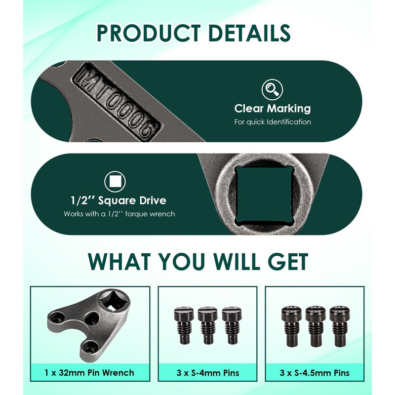 - PACKAGE: 1/2" socket drive, Pin Wrench with a size of 32mm x 4mm/4.5mm