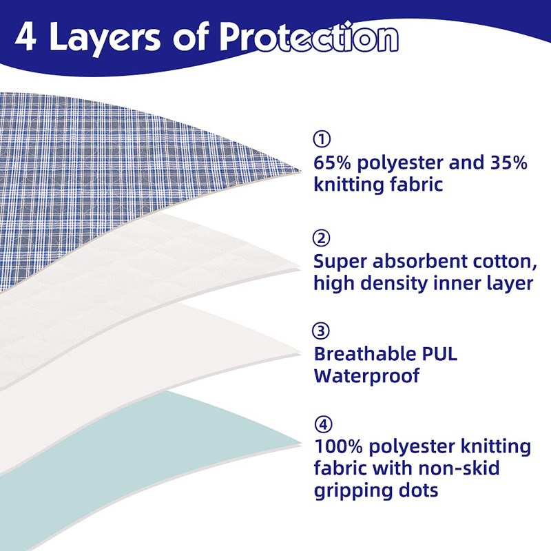 - 4-layer design: Our mats adopts a 4-layer design. The first layer of polyester knitted fabric has a soft surface.the second layer is super absorbent,high density inner layer. The third layer is breathable and waterproof.The last layer are non-skid gripping dots.Keeping your sheets and bed dry and protecting all night while still being comfortable.