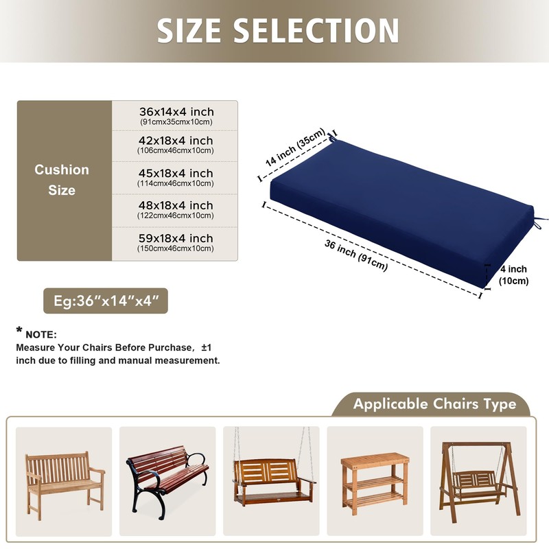 - 【Enhanced Comfort & Support】: Filled with high-resilience shredded foam, our outdoor bench cushions provide optimal comfort, reducing pressure on your hips. Available in multiple sizes (36"x14", 42"x18", 45"x18", 48"x18", 59"x18"), they offer a plush, supportive seating experience for patio benches, loveseats, entryway benches, piano benches, or porch swings.