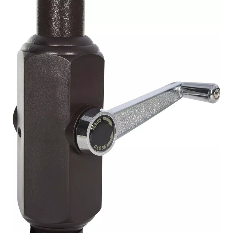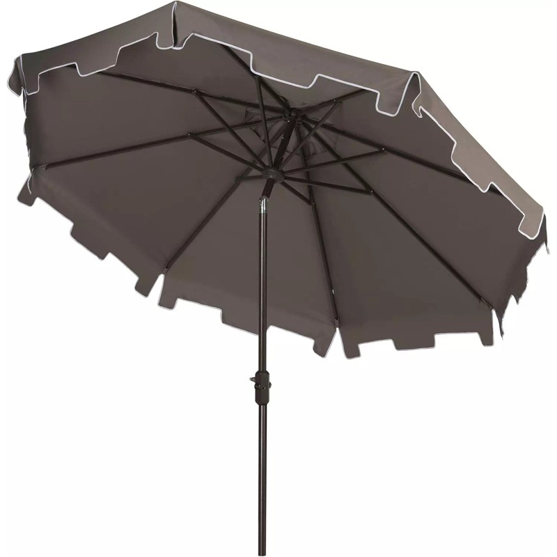 A classic market umbrella gets a chic makeover with fashion-forward gray fabric and a valance for extra sun protection and European flair. Its nine-foot polyester canopy and sturdy brown aluminum frame make it the ideal umbrella for veranda or pool deck. Includes easy crank and tilt mechanism.