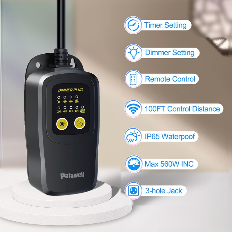 - 560W Rated Output Compatible Outdoor Dimmer: Outdoor dimmer’s 3-pin grounded design have high safety performance.This 560W light dimmer compatible more types of LED dimmable string light, filament lamp and incandescent bulbs.Simple to plug in then can be used, only need to use the remote control can be arbitrary control the brightness of the light string and make OFF or ON.