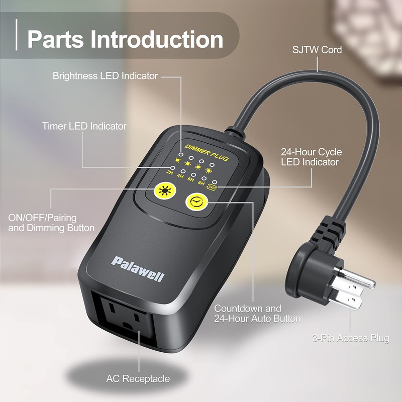 - IP65 Waterproof String Light Timer Dimmer: Using V0 grade fireproof material, PC shell structure,, internal silicone filling,with fast heat dissipation, waterproof strong characteristics. And there is overload protection function, when the output power overload, the plug in dimmer will automatically protect and reduce the brightness of the light string. light dimmer is very suitable for indoor & outdoor, with the characteristics of resistance to wear and tear, humidity, cold, sunlight, etc.