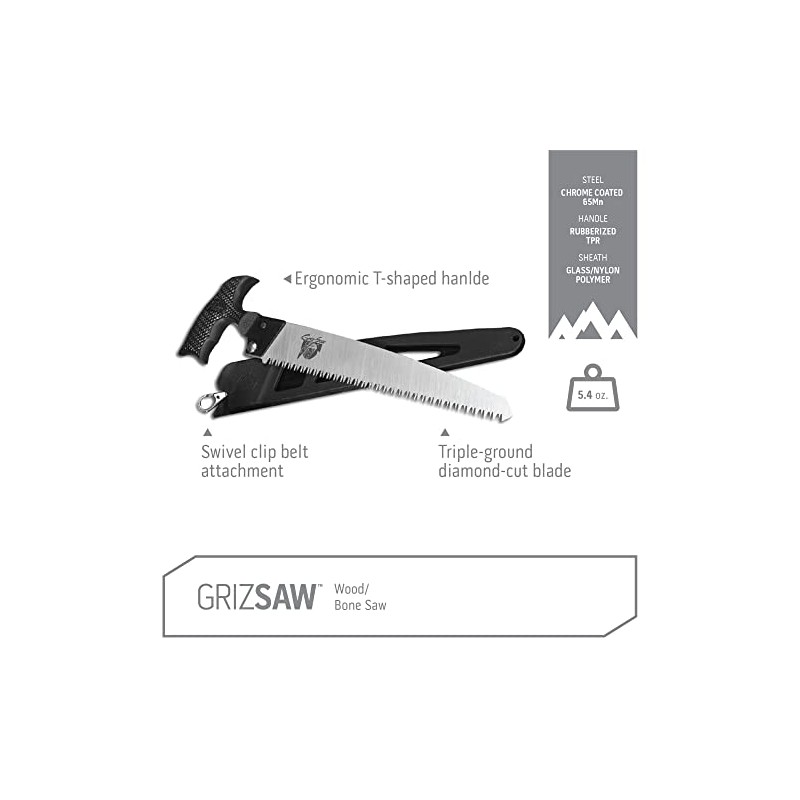 This practical field saw features a T shaped handle to allow comfortable straight wrist cutting from any angle, which reduces fatigue during long use. The 8.0 inch 65Mn spring steel blade with triple ground tooth pattern creates an aggressive cutting edge for penetrating tough bone and wood. The Griz Saw comes complete with a locking, quick release, Zytel sheath with swivel clip attachment.