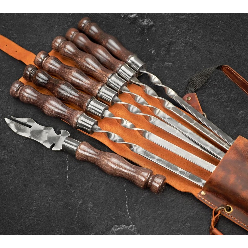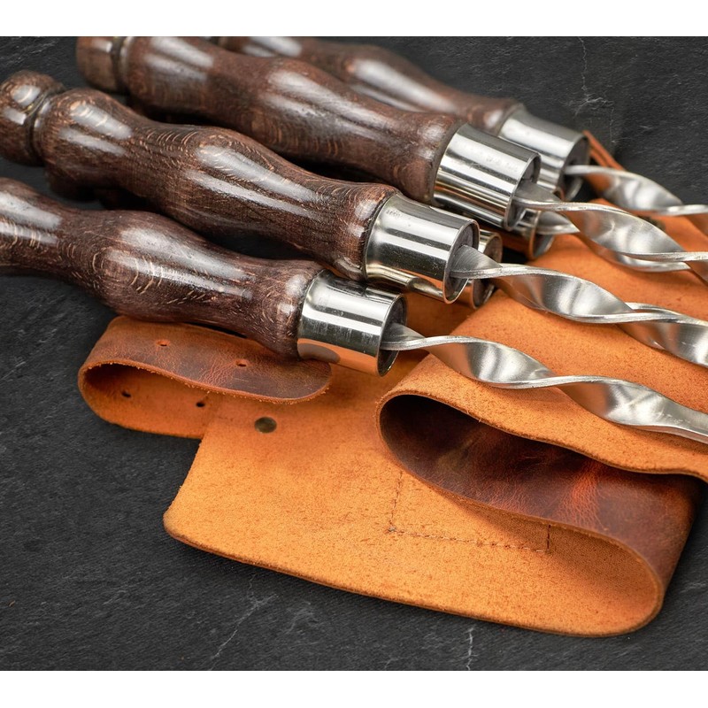 - Contents of the set: We provide high-quality skewers in a thick leather case that will last you a lifetime Contents of the set: 1. Skewer 6pcs (stainless steel) 2. Double prong skewer1pc (stainless steel) 3. Fork-knife for removing meat 1pc (stainless steel)
