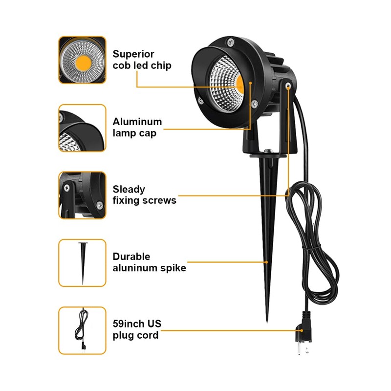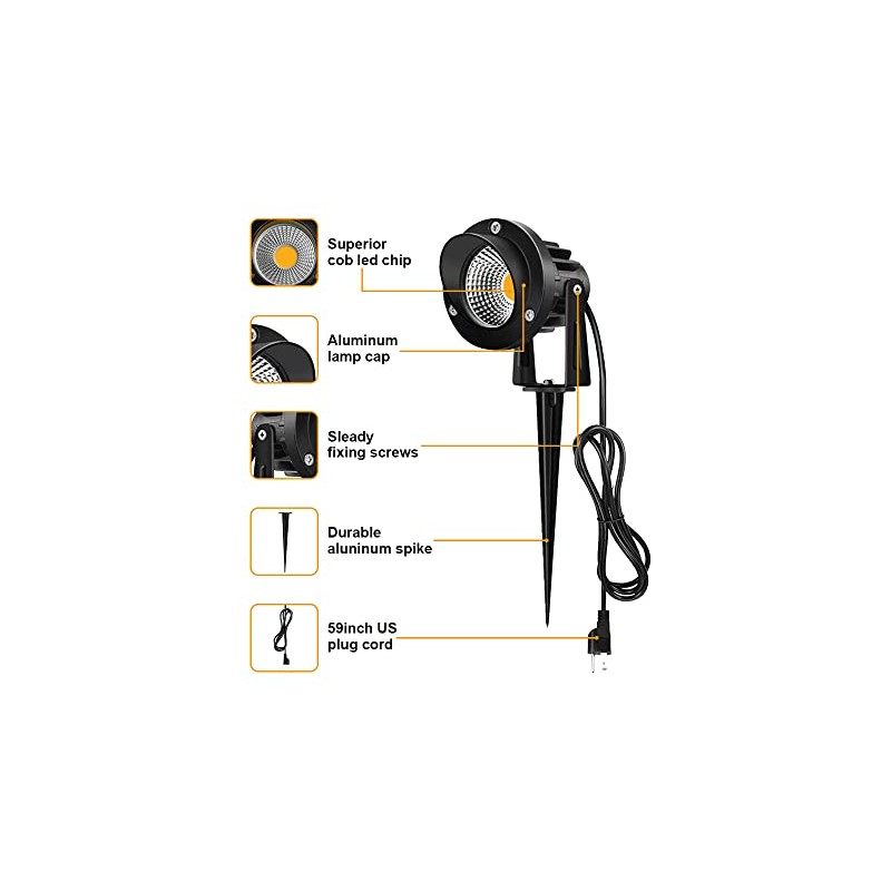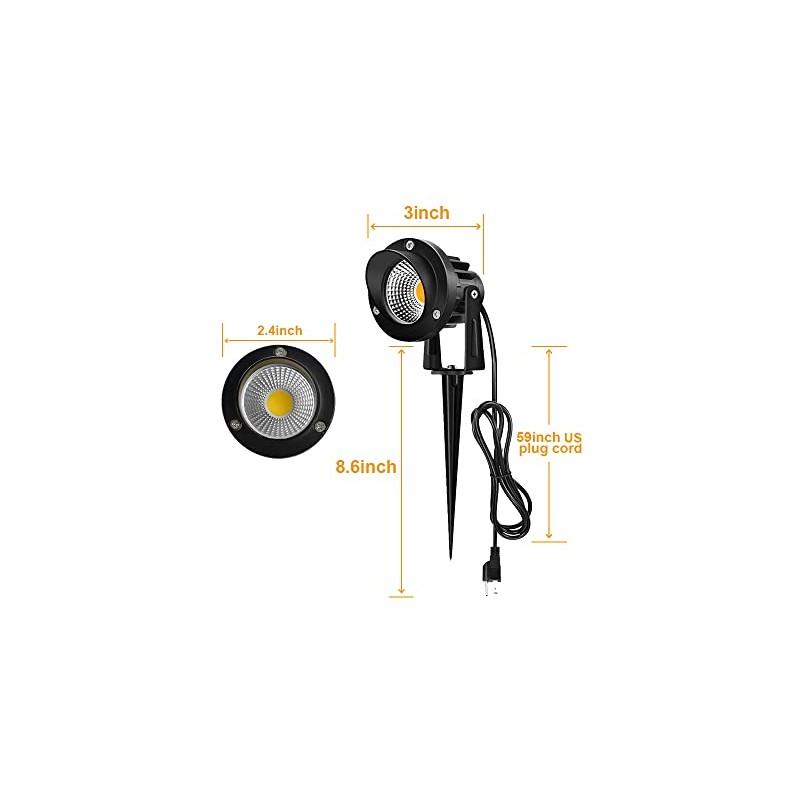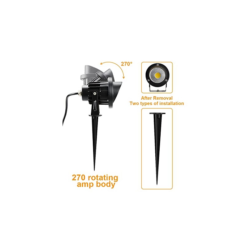 - 【EASY TO INSTALL 】Led landscape spotlights suit to 110/120V AC. Comes with 59inch 3-prong US power cord, plug and play. You can adjust the emitting angle by the 270 degrees rotating bracket and spike base.