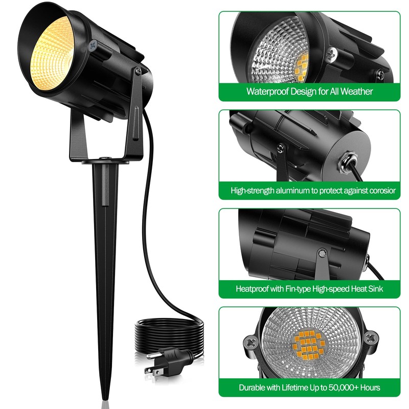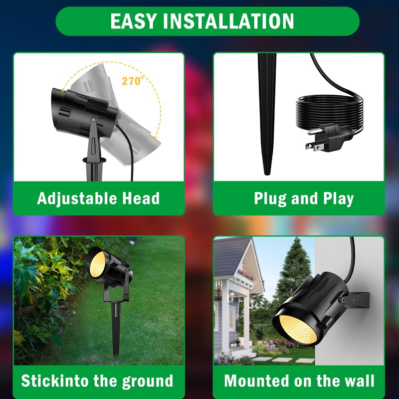 - Easy Installation: Spotlights for yard Plug and Play, no switch, anyone is easy to install and use, outside lights landscaping is made of high quality die-cast aluminum, can prevent any corrosion, cracking, rust, more safe and reliable. Greatly improving the stability of outdoor lighting and long-term use