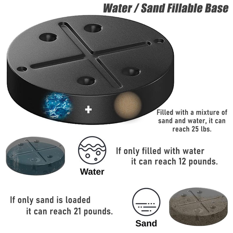 - Add Water or Sand: Can be filled with sand and water, once filled, the sand adds 25lbs, If using sand, it is recommended to use dry quicksand. of weight providing extra stability during breezy conditions. This Sand Box has a very good seal and will not leak water or sand.