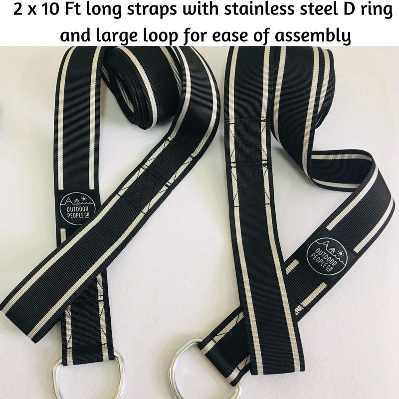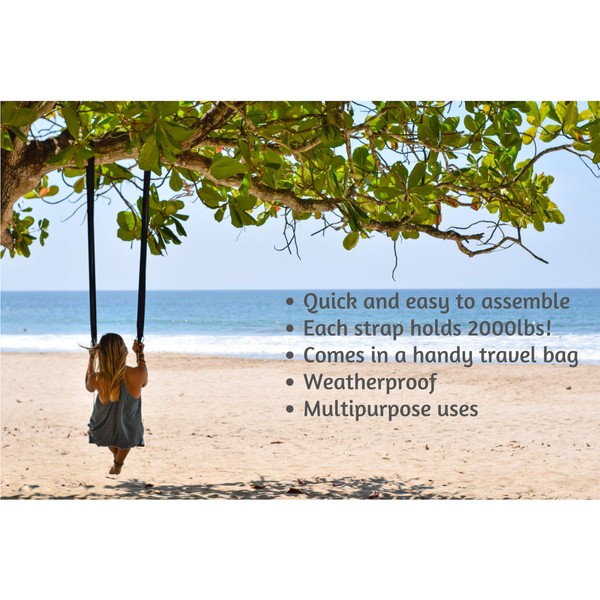 Our strap kit includes **2 x 10 ft heavy duty straps** which have a double stitched loop on one end and a stainless steel D ring on the other for quick assembly and extra strength. **Each strap holds 2000lbs!!** Also included are 2 Stainless steel carabiners with screw lock for security and all of this comes in our travel sized carry pouch. These straps are long enough for almost any swinging or hanging situation and strong enough to ensure all the family can enjoy using them. Use the included **free and easy instruction guide** to be up and swinging in no time at all.