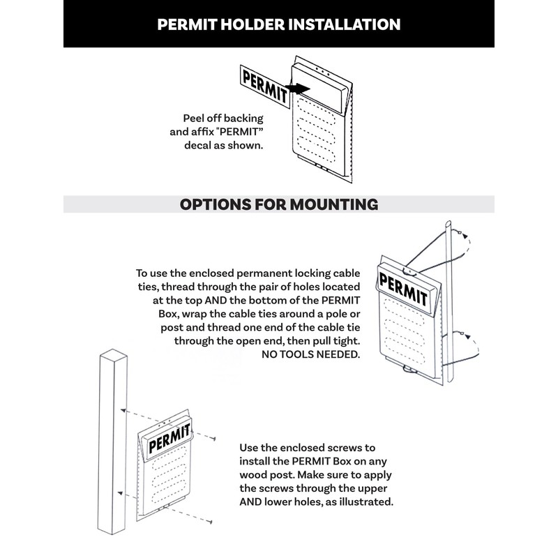 - Easy & Versatile Installation – This permit box attaches effortlessly to any sign, post, chain-link fence, or flat surface using the included mounting hardware—two wood screws and two nylon cable ties. The bold red "Permit" decal enhances visibility, ensuring quick and easy document access when needed.