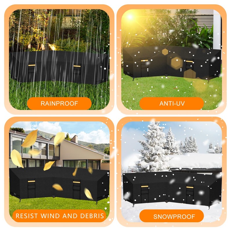 - Super Waterproof: This patio sectional cover is coated with a layer of pu waterproof coating on the durable polyester fabric, better than others thin 190T,210D,300D polyester oxford cloth,after testing,the material water pressure is 2400pa.Even if there is a week of water,there will be no water leaking to damage your outdoor sectional sofa. We have a unique design at the stitched, we added a waterproof strips that seals the fabric and makes the water more impenetrable