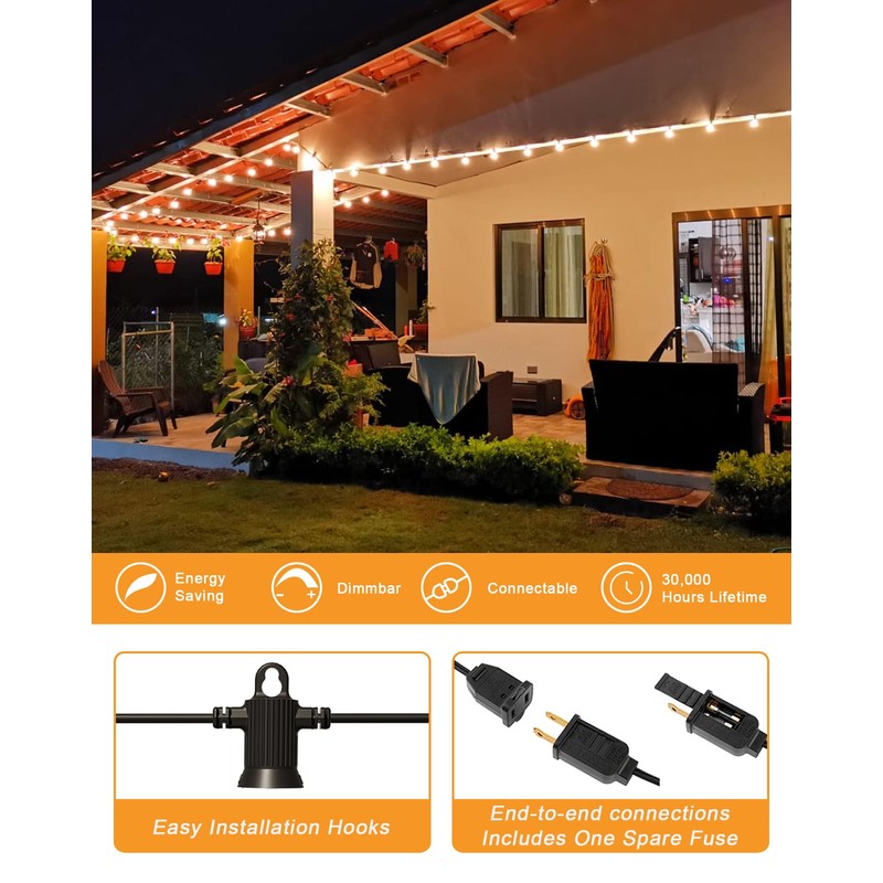 - Dimmable & Connectable: Outdoor lights for patio are compatible with the ordinary dimmer(NOT Included), which makes it easy to choose the atmosphere you want. Each string of lights has an end-to-end connection, so you can chain multiple sets to the perfect length for any installation.