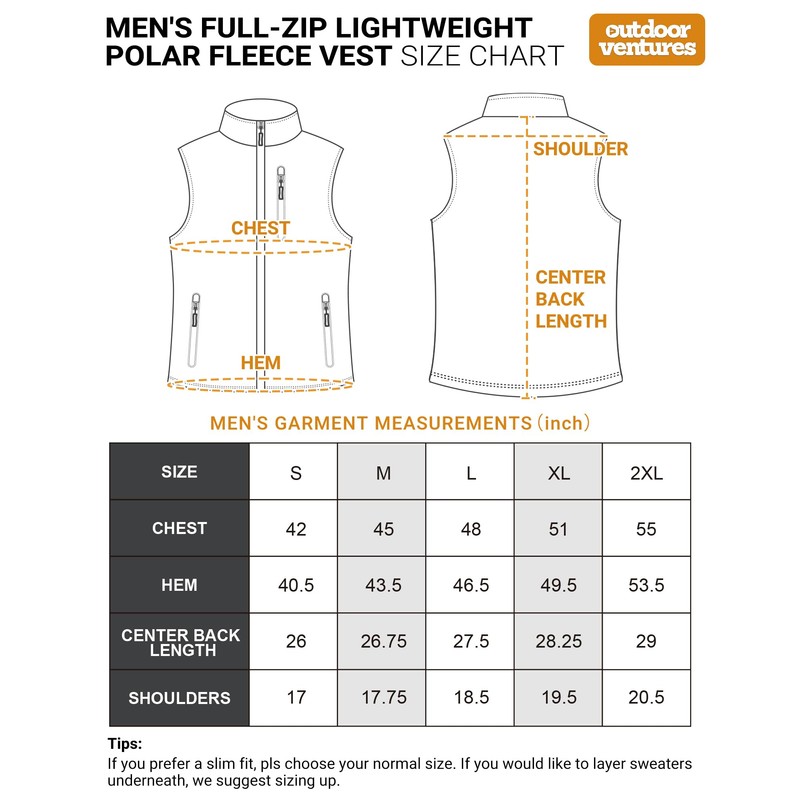 - Classic Fit & Warm Versatility----This lightweight sleeveless fleece gilet can be worn as a mid layer on freezing days or an outer layer in mild cool weather.If you prefer a slim fit, pls choose your normal size. If you prefer extra room to layer, pls size up. Any problem please contact us, we are always here for your.