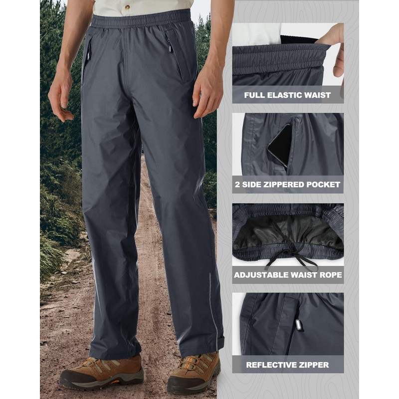 Outdoor Ventures Men's Packable Rain Pants Lightweight Waterproof Rain Overall Pants for Hiking Fishing Golf Grey
