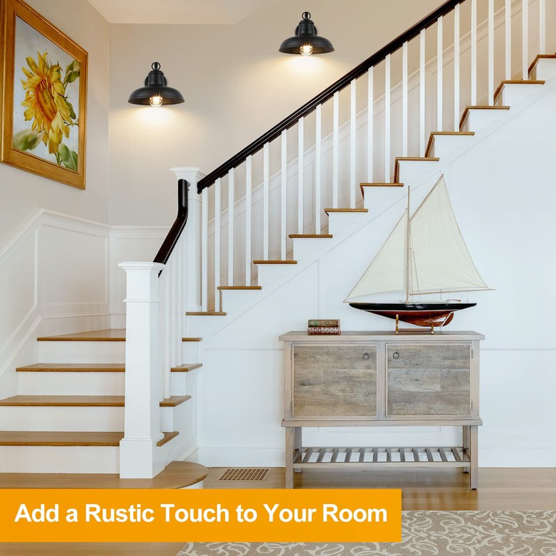 - 💪 【Elegant Design & Premium Quality】Inspired by barn lighting, these outdoor wall sconces adopt frosted black finish and classic design that bring tons of farmhouse charm to your home. Made of premium iron, these wall light fixtures feature classic barn lamp shade supported by a strong arm, helping focus downward lighting. The exquisite black coating not only works excellent on anti-corrosion and anti-rust function, but also adding timeless elegance and creating a charming ambiance to your house.