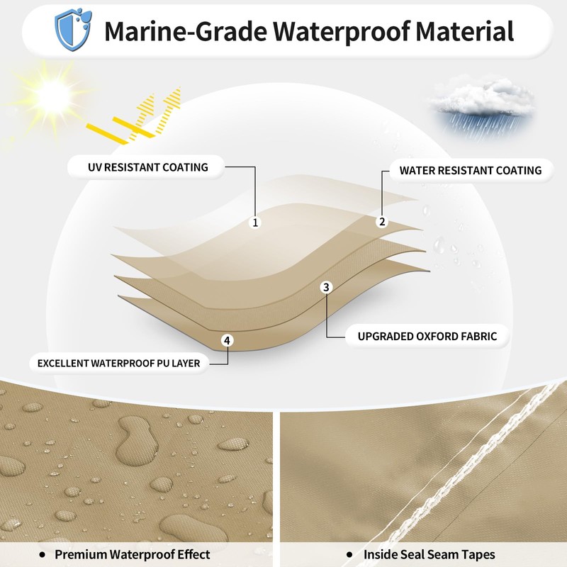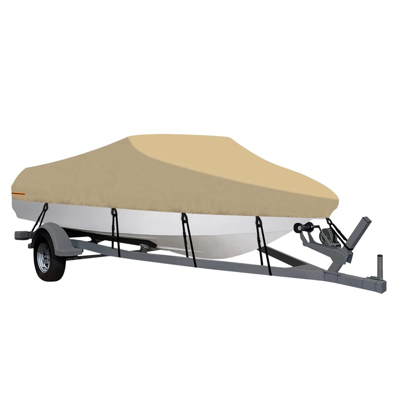- Waterproof & UV Resistant Oxford Fabric Boat Covers: Made of 420D high density Oxford material coated with advanced UV resistant layer, these 100% waterproof boat cover can withstand the extreme weather like pouring rain and raging blizzardis and scorching sun. The lightweight and strong fabric resists shrinkage and also protect your boat from bird damage. They are fade resistant and made to last long.