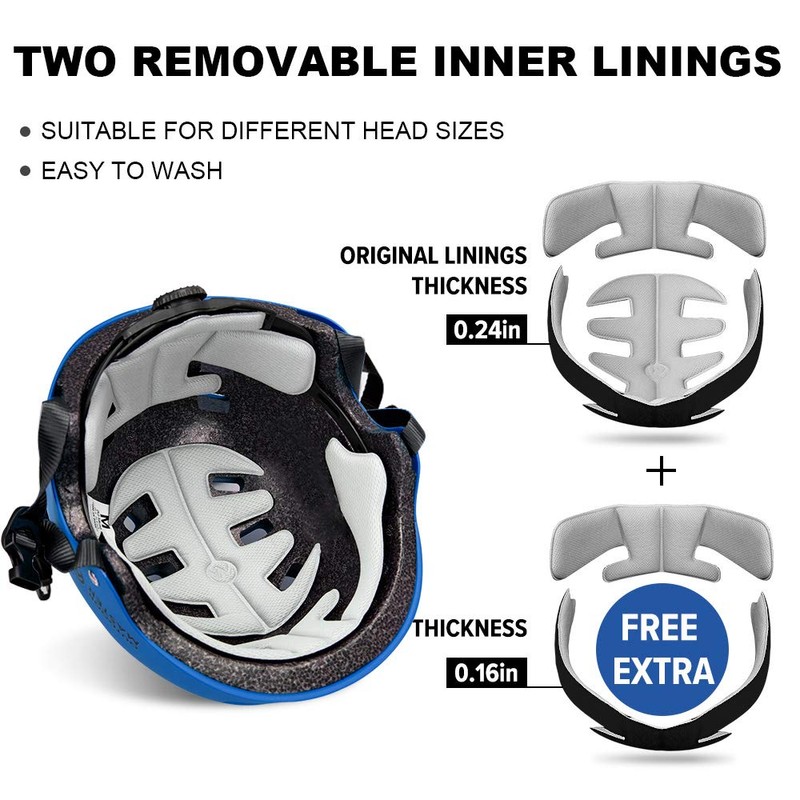 - EXTRA REMOVABLE LINING - Skateboard helmet with two removable liner for different head sizes and easy to wash the sweat away.