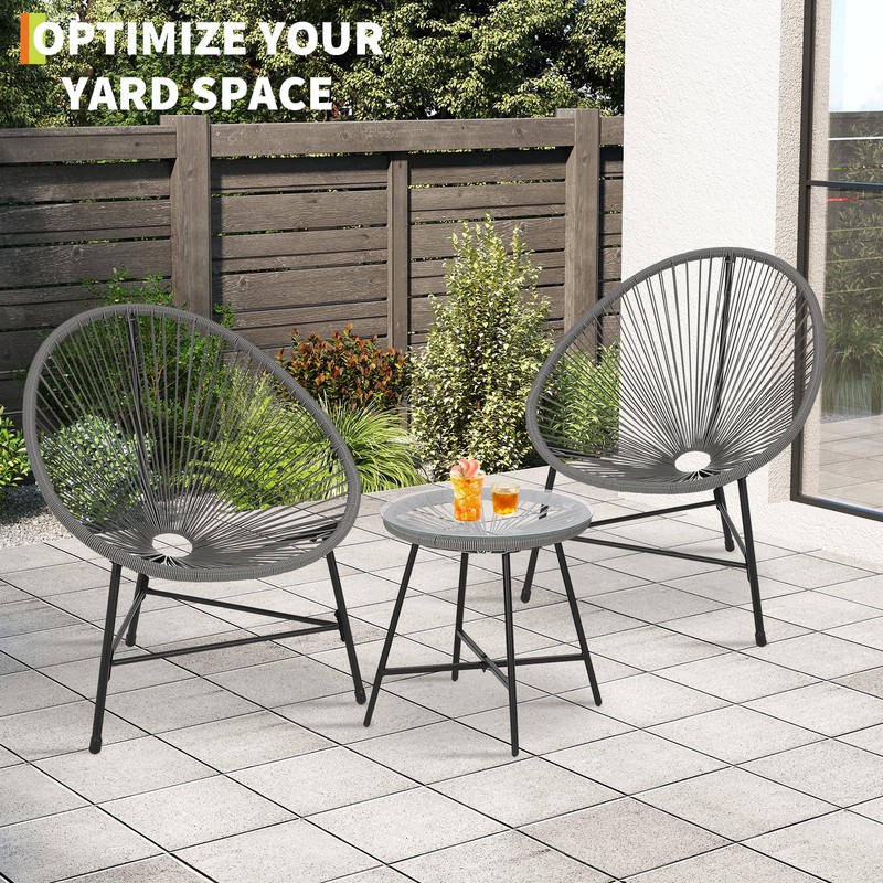 OutdoorVibe 3 Piece Acapulco Chair Set, All-Weather Modern Patio Furniture Set with Plastic Rope, Glass Top Table and 2 Chairs, Woven Patio Conversation Bistro Set, Gray