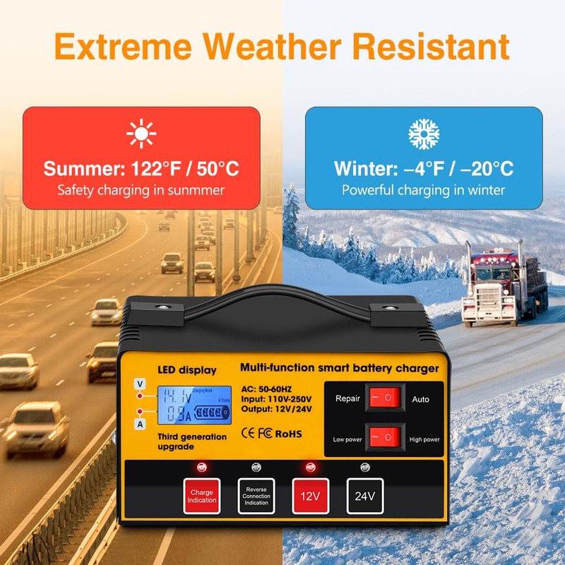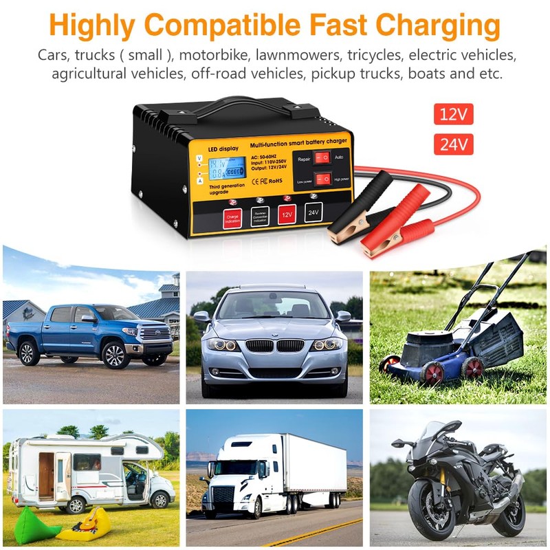 - đ ă Multi-Function Battery ChargerăDiagnose and repair various battery problems, including flooded or sealed maintenance free batteries. Pulse repair function can help to repair your loss battery and extend battery life. Compatible with all 12Volt & 24Volt lead-acid automotive, marine, deep-cycle batteries: flooded, gel, AGM, maintenance-free, WET, CAL, EFB on automotive vehicles, motorcycle, marine, RV, Powersport, lawn&garden, small truck, scooter, etc.