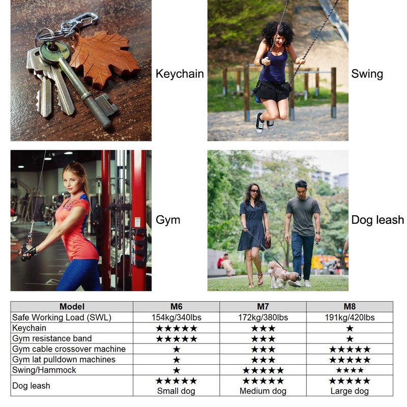 - MULTIPURPOSE.The carabiners are suitable for various occasions(depends on what size you choose),such as gym workout,keychain,swing,hammock,dog leash,security,gardening,camping,hiking,backpack and a lot more.