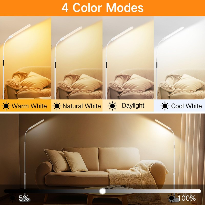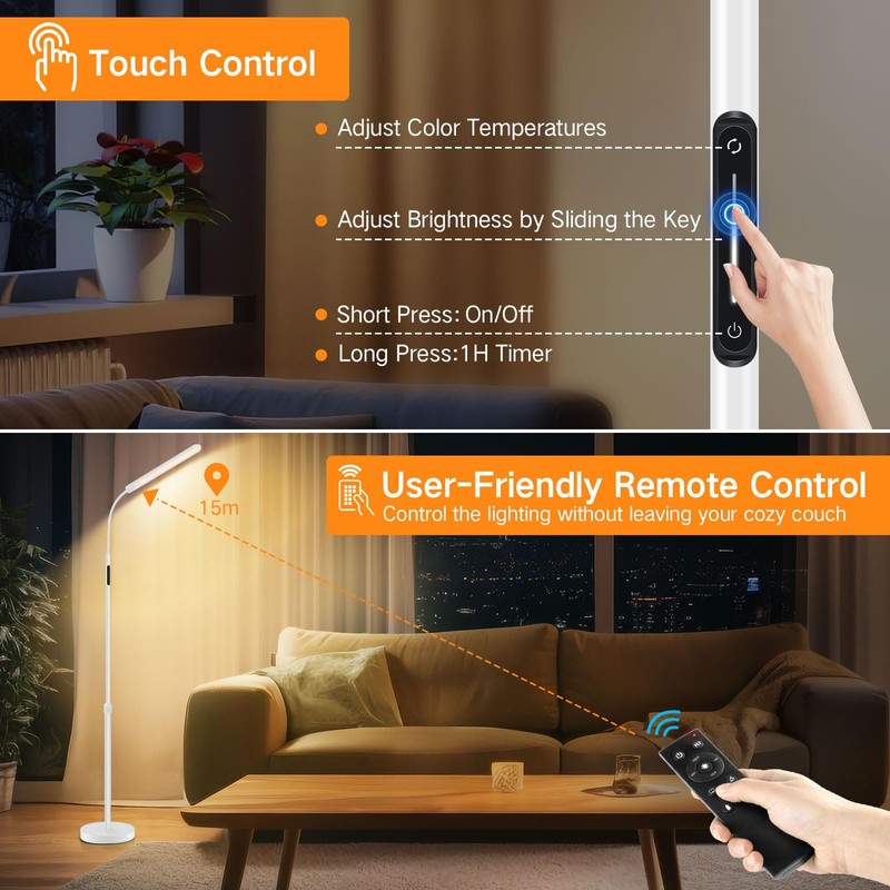 - Remote & Touch Control: This standing lamp offers effortless control with its convenient remote and touch-sensitive features. Adjust brightness (10%-100%) and select from four color temperatures (warm, warm white, cool white, and daylight white) via a simple touch or from up to 15 meters / 49.2 feet away. The upgraded touch control allows you to glide your finger to effortlessly alter both brightness and color temperature, ensuring perfect lighting tailored to any mood or occasion.