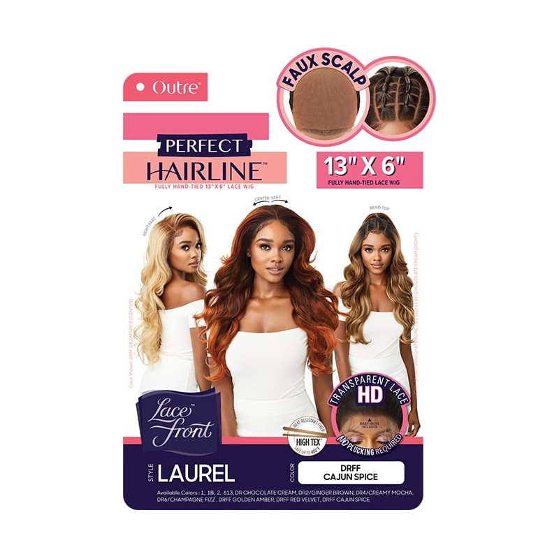 **Outre HD Lace Front Wig Perfect Hairline Fully Hand-Tied 13X6 Lace Wig Laurel** **WHAT IS FAUX SCALP?** It’s a skin0toned, soft lace lining that makes the spaces between the lines of the HD lace appear smaller for an even more realistic scalp appearance. **LIFE ISN’T PERFECT, BUT YOUR HAIR CAN BE.** Say goodbye to lace grid lines, and get the realest look with Faux scalp. This Perfect Hairline 13”X6” HD Lace frontal wig features a skin-toned, soft lining for less visible lace, and a smooth bade that is easy to tint and conceal. Achieve a hair line and scalp that is pure perfection with this unit that offers it all.