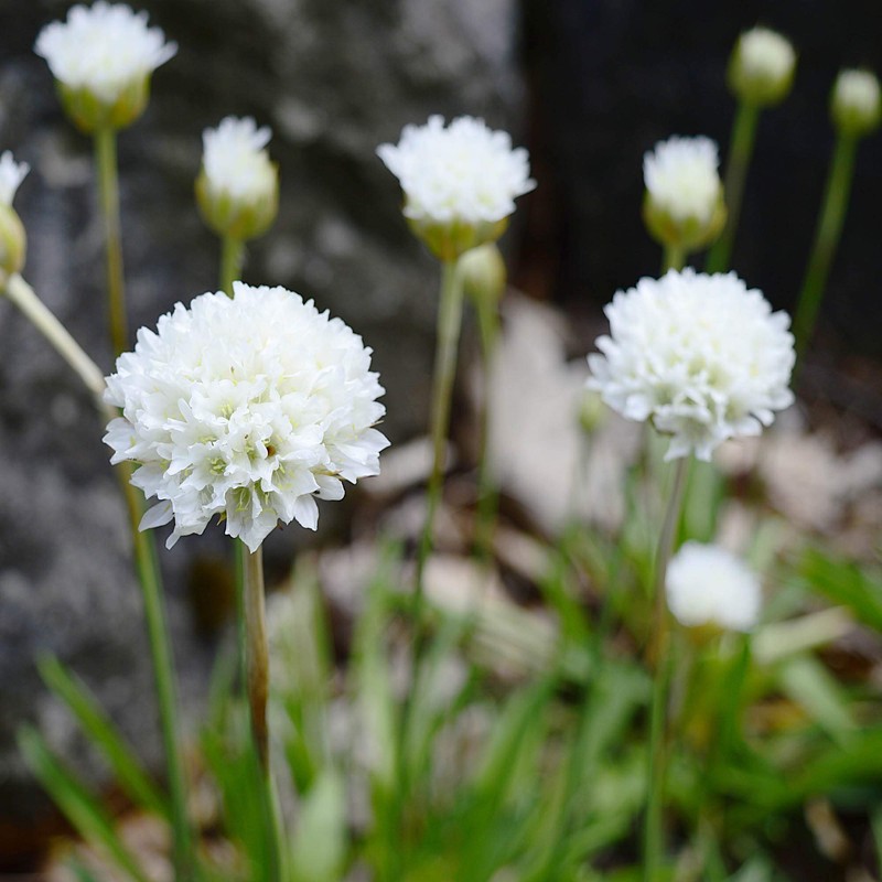 Armeria Maritima Alba (Thrift/Sea Pink ) - Armeria tolerates drought and salt well and will grow in dry soils; however, it prefers soil that are well- drained, loamy, sandy or clay with a neutral pH (7.0) Armeria are known as one of the easiest grown perennials. Good for container plantings, the rock garden, border, or as a ground cover. Deadheading will prolong flowering and depending on mother nature it may flower clear until early Fall. Dividing should be done in early spring to rejuvenate plant. Plant may rot in center if soil is poorly drained. Armeria in general do not need to be fertilized. Armeria Alba has pure white flowers clustered in tight pompons which hover cheerfully on slender stems above tufts of narrow leaves. Grasslike foliage forms low clumps; ideal as a small-scale ground cover or as a specimen in the rock garden.