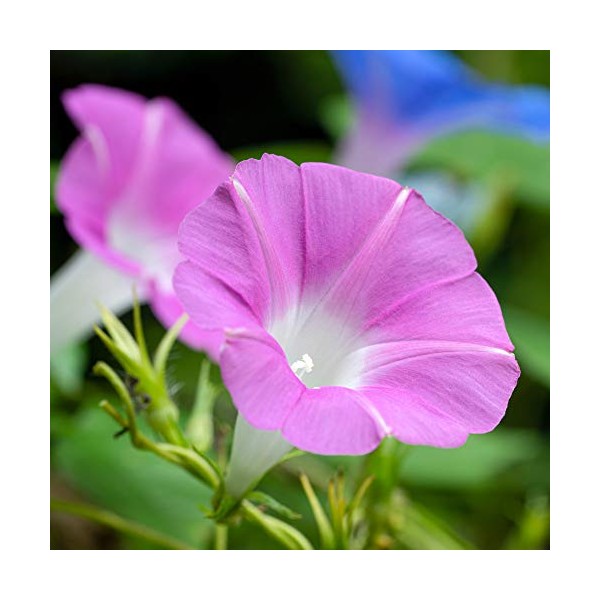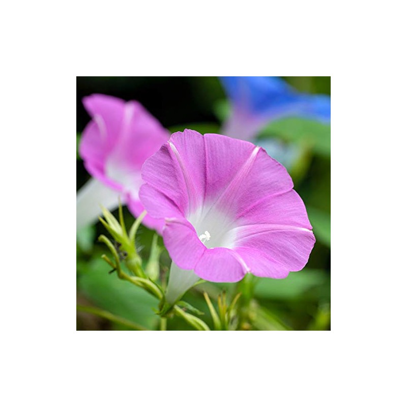 - This variety is more compact and bushy, only climbing 3 - 4 feet. It can be grown non-supported in containers and baskets and is very nice hanging over the edges. It has clear pink large blooms. Morning Glory also has lovely foliage, deep green, heart-shaped leaves that provide the perfect back-drop for the colorful blooms.