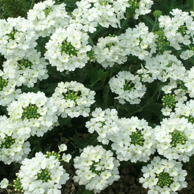 Verbena hybrids nana compacta is simply known as Verbena. It is a tender perennial that is usually grown as an annual in most parts of the United States. It is usually considered to be both rabbit and deer resistant. This variety of Verbena is a wonderful low-growing flower that works well as a ground cover or in baskets and containers. It is a brilliant white in color and looks lovely spilling over the edges of a window box! Verbena has flower clusters that can measure up to 3 inches across, and it will bloom from late spring right up until the first frosts of fall. Start Verbena seed indoors 4 – 6 weeks before the last expected frost date. Soak the seed in tepid water for 24 hours prior to planting. Press the seed into soil, cover lightly with peat moss and keep the seed moist. Verbena seed needs darkness to germinate, so cover the starter trays with black plastic or newspaper with air holes cut in it. With a temperature of 75F, germination is usually within 28 days. Grow Verbena in full sun and well-drained soil. Space plants 12 - 18 inches apart. Trimming Verbena back 1 – 2 times during the growing season tidies their appearance and stimulates more blooms.