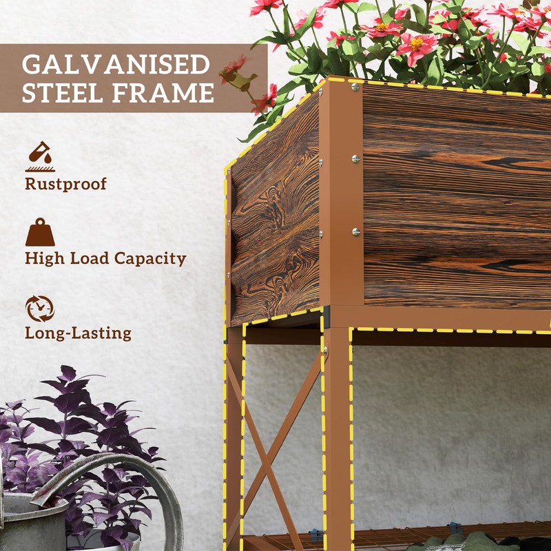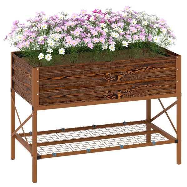 Outsunny Raised Garden Bed with Galvanized Steel Frame, Storage Shelf and Bed Liner, Elevated Planter Box with Legs for Vegetables, Flowers, Herbs, Dark Brown