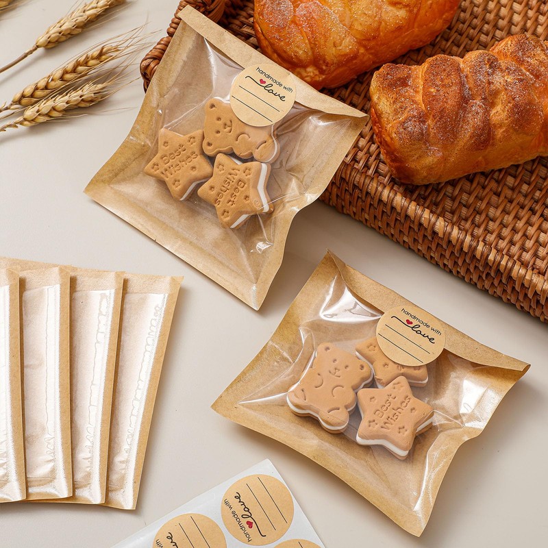 Outus Outus 100 Pcs Heat Sealable Cookie Bags with Window 4 x 4 Inch Grease Resistant Kraft Bakery Pastry Bags with Paper Stickers for Packaging Donut Bread Cookie Goods Sandwich Baked Treat