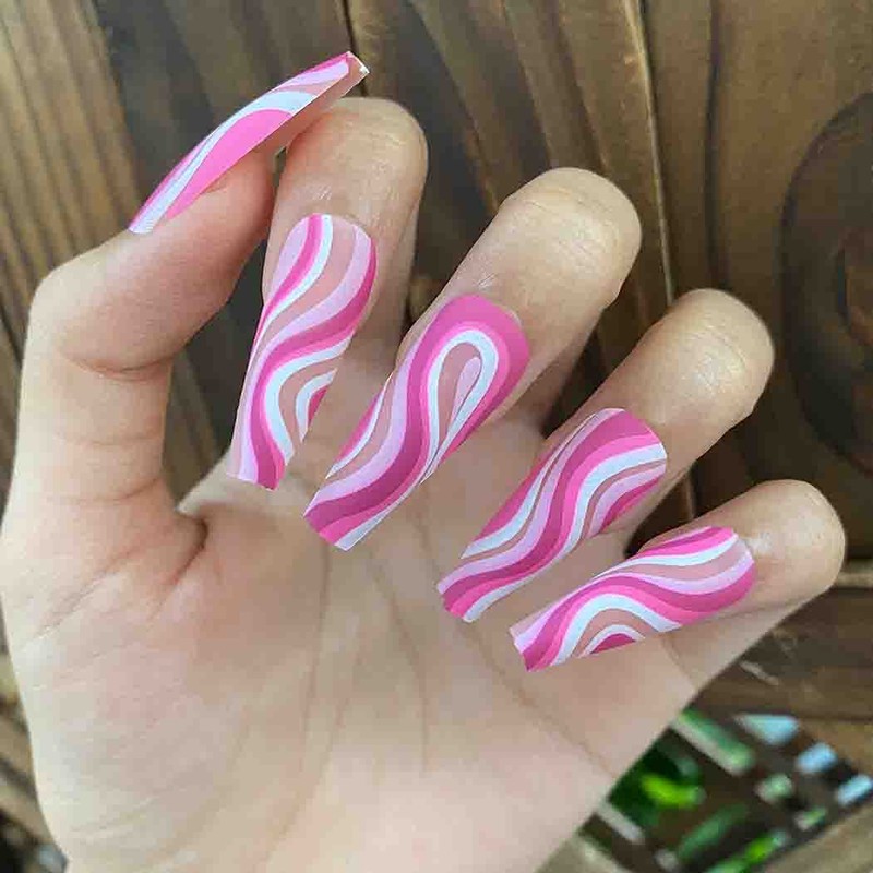 Outyua Designed Fake Nails Coffin Candy Printed Press on Nails Pink Matte Extra Long False Nails Designer Full Cover Acrylic Nails for Women and Girls 24pcs