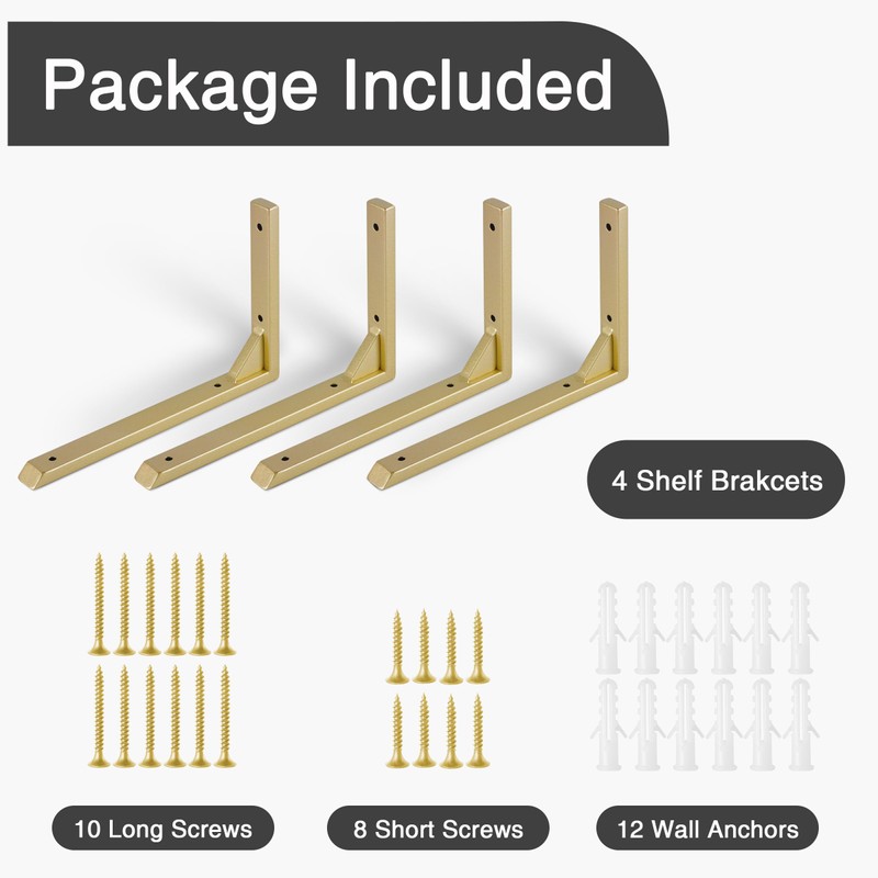 - CONTENT: 4pcs heavy duty shelf bracket (Wooden shelf is not included), 8pcs gold long screw and 8pcs anchor (for wall), 8pcs gold short screw (for shelves).