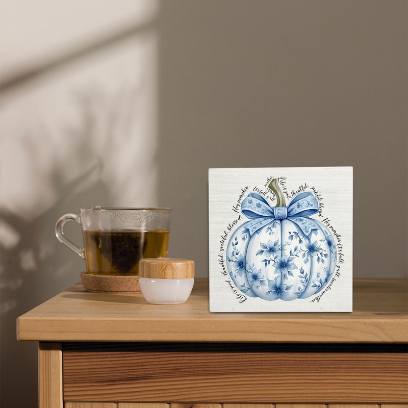 OVAcational Chinoiserie Fall Pumpkin Wooden Box Sign Desk Decor, Coquette Blue Bow Grandmillennial Autumn Pumpkin Wood Block Sign for Home Office Desk Table Shelf Wall Decorations, 5x5 Inch