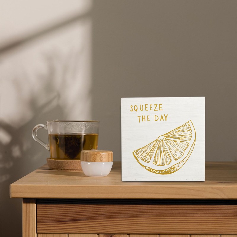OVAcational Funny Kitchen Desk Wooden Signs,Squeeze The Day Wooden Box Sign,Lemon Kitchen Decor,Summer Farmhouse Lemon Decor For Home Desk Tabletop Shelf Decoration 5x5 Inches