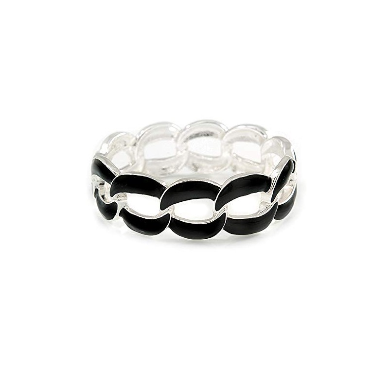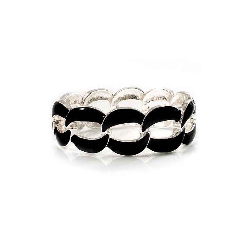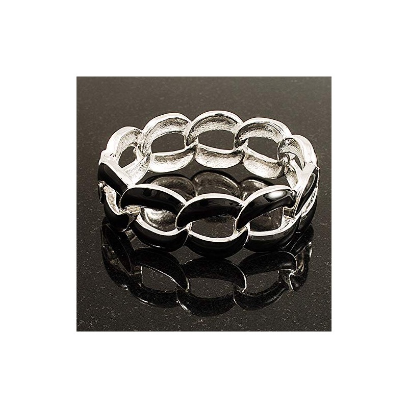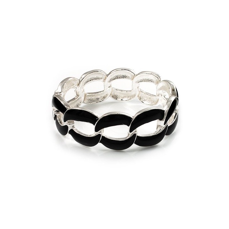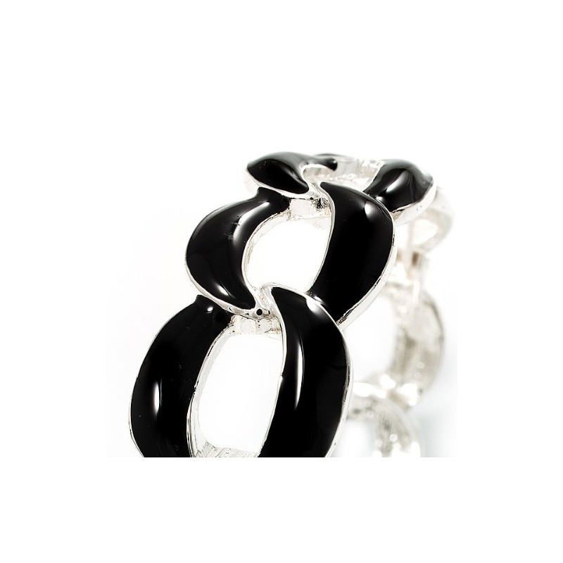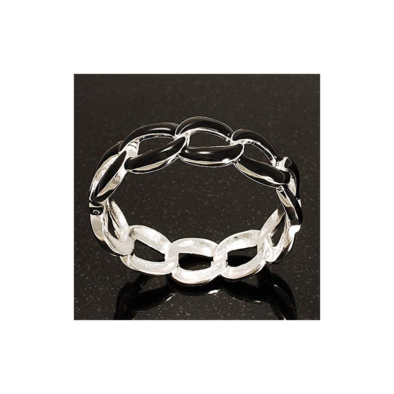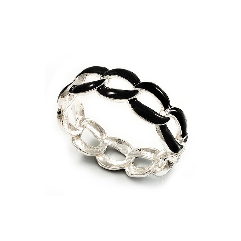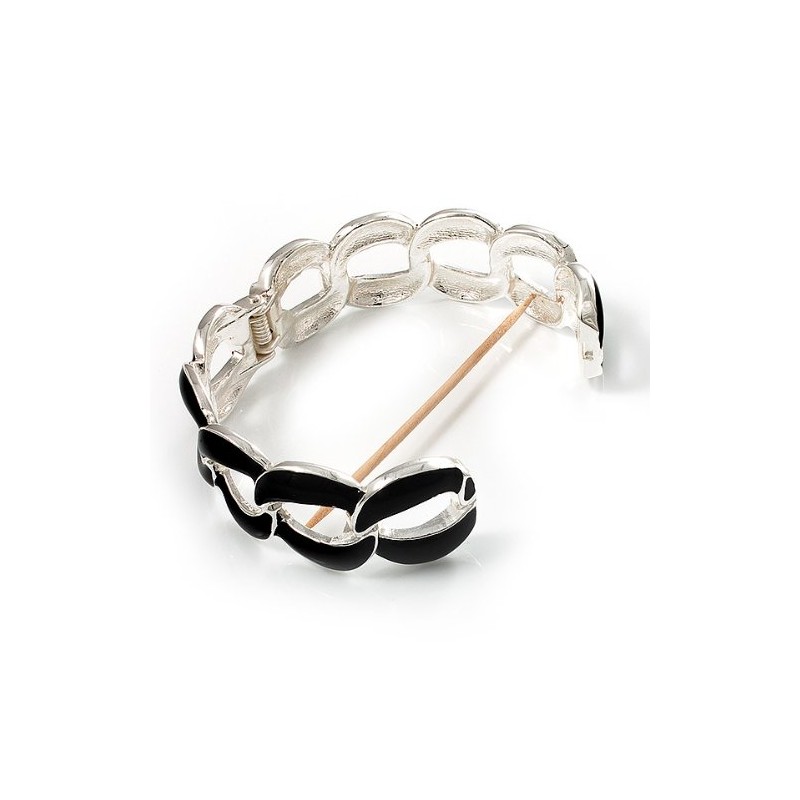 Oval Link Chain Enamel Hinged Bangle Bracelet in Black/Silver Tone/Size M