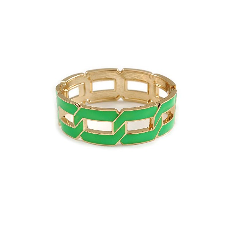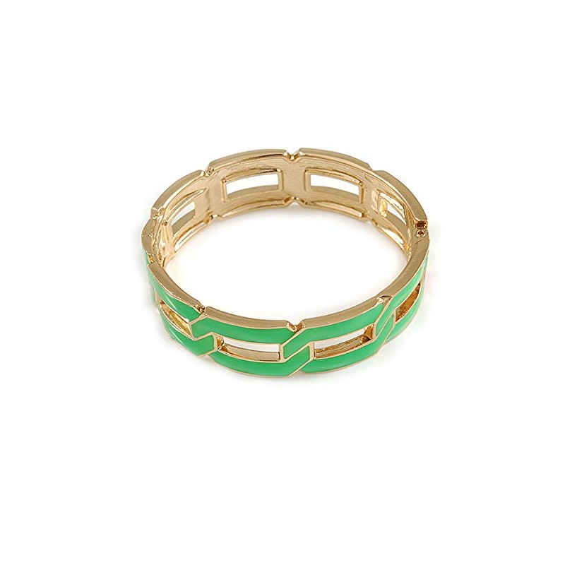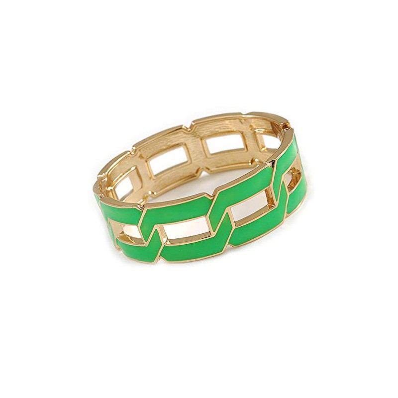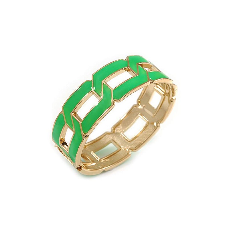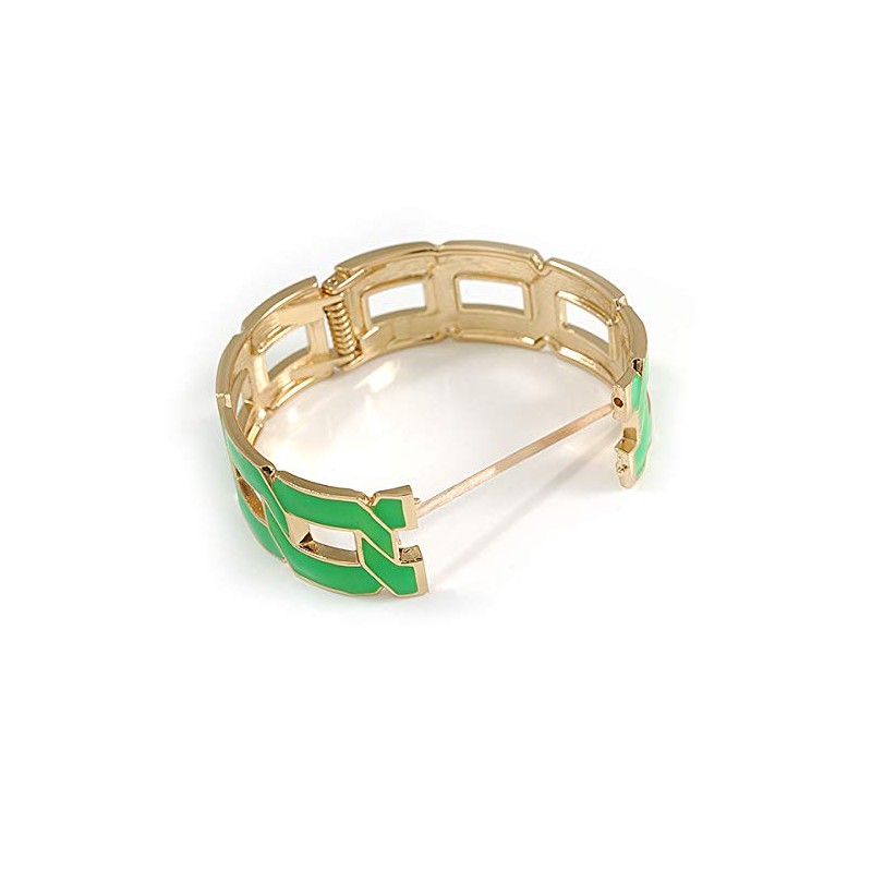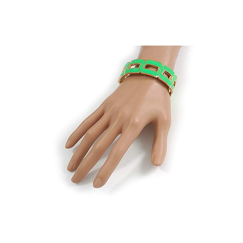 Oval Shape Neon Green Enamel Link Hinged Bangle Bracelet In Gold Tone - Size M/L