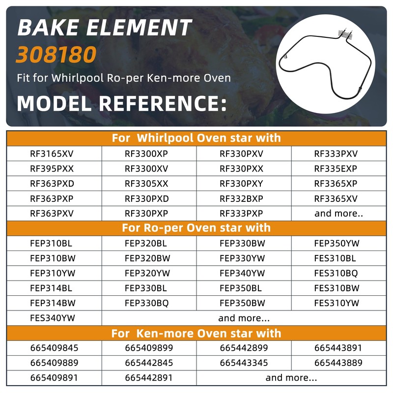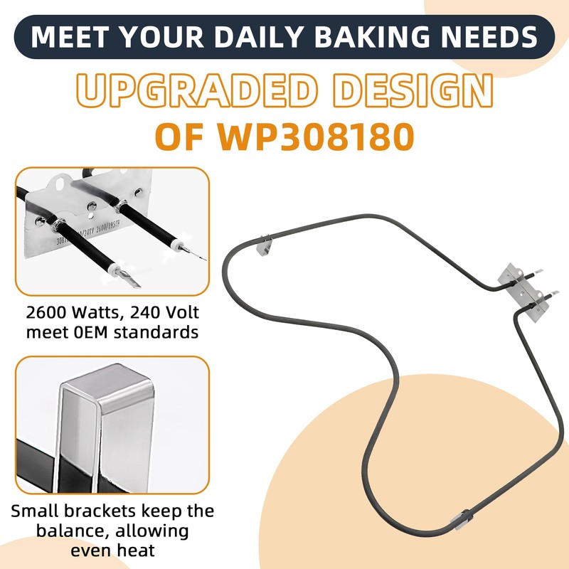 - 【PREMIUM QUALITY】WP308180 bake element made of durable, high-quality nickel stainless steel alloy, and carefully tested by the manufacturer-in line with OEM standards-to ensure long-lasting and effective performance and the official Amazon logistics is fast. Installation is convenient and quick, saving time and effort