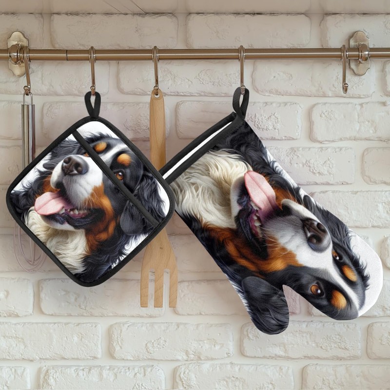 Oven Mitt and Pot Holder Set of 2 Heat Resistant Bernese Mountain Dog Mammal Oven Gloves Hot Pads Potholders Durable Kitchen Accessories for Cooking Microwave Baking Grilling
