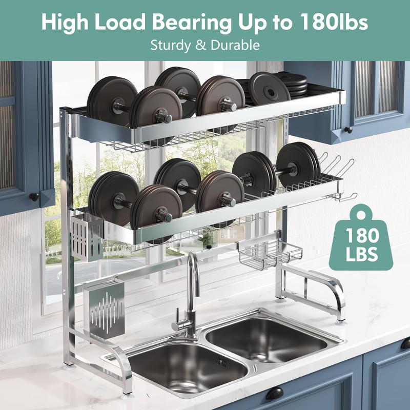 - 【Large Capacity for Saving Space】: Three-tier design to free up 80% of the countertop and create a neat and clean kitchen without taking up space. This above sink dish dryer rack can hold a variety of cookwares, it has two height and length adjustable racks to store oversize plates, bowls, pots and plants. It also has 1 utensil holder, 1 cutting-board holder, 1 knifes holder, 10 practical hooks, 1 detergent holder, and 1 heavy-duty cup holder to hold cups and wine glasses.