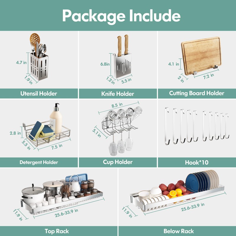 - 【Height & Length Adjustable Racks Fit Most of Kitchen Sink】: Adopts expandable design, the length can be extended from 25.5in to 35.5in, fit to different kitchen sink. In addition, the side bracket adopts a snap-on structure, so you can be removed or installed the rack, also can easily adjust up and down anytime. Besides, if you have a taller faucet, you can install the below rack a little higher