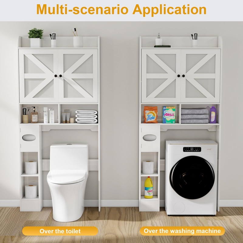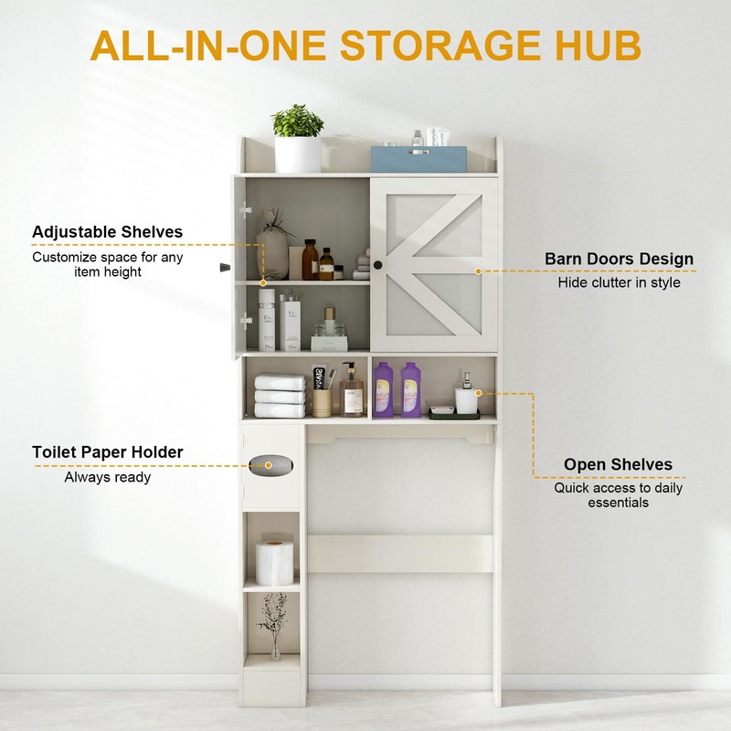 - [Reclaim Your Bathroom Space]Tired of a cluttered countertop? This over the toilet storage cabinet transforms the unused vertical area above your toilet into a smart storage hub. Featuring a spacious cabinet with stylish barn doors, multiple open shelves, and a dedicated toilet paper holder, it’s the perfect freestanding solution to keep all your bathroom essentials organized and within reach.