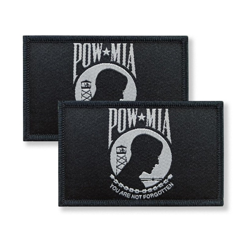 - SPECIFICATION: Set of 2 Pow Mia flag patches with hook-fastener backing per pack. The right size (3.2 x 2 inch/8 x 5cm) allows it to be sewn into any garment.