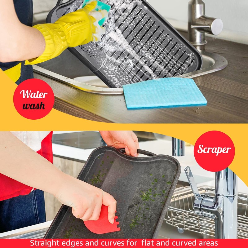 - Two Scrappers Included: 2-pack pan scrappers included for cleaning the stuck on food on both sides, the practical straight edges and curves designed to easily clean any gaps or corners. Please note item is sold as one tray and the image shown on the website is the front and back image of the single tray item.